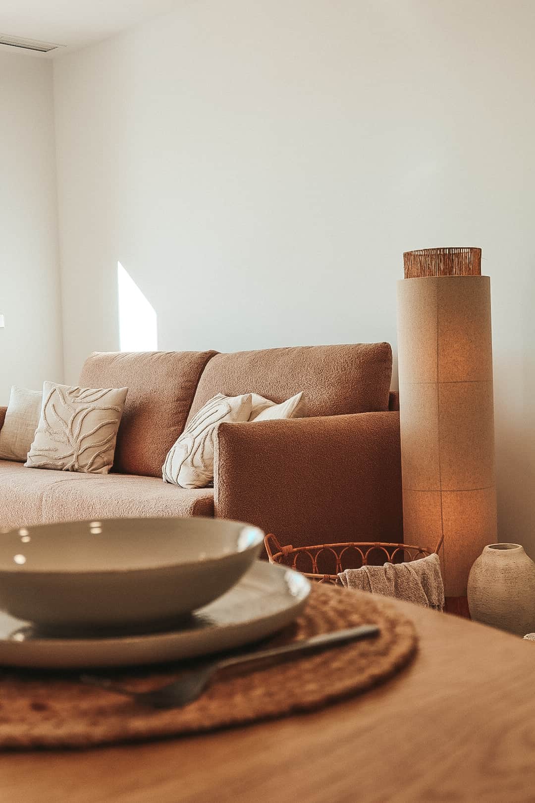 Het interieur is ingericht met natuurlijke materialen, zachte aardetinten en zorgvuldig gekozen designstukken. De organische vormen, lichte texturen en subtiele decoratie creëren een serene en stijlvolle ambiance.